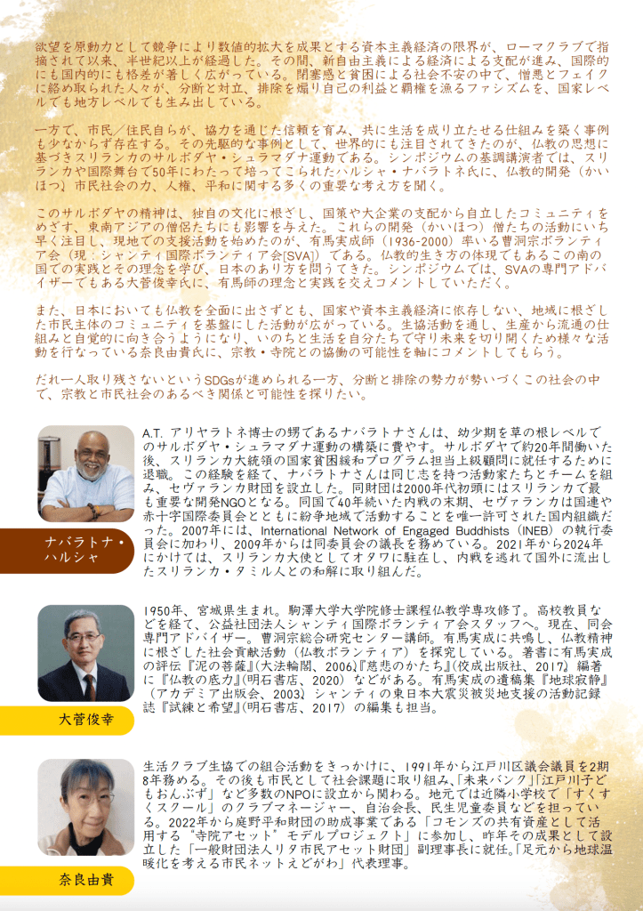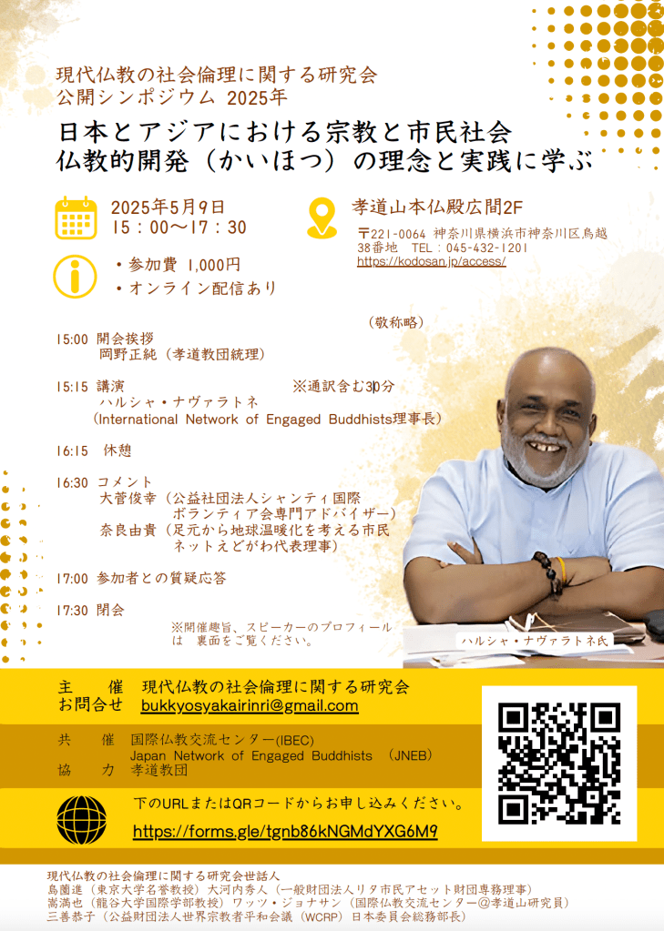「現代日本における仏教的社会倫理の課題」研究会は、日本社会における社会倫理のあり方に関心を持つ仏教学者、僧侶、社会活動家らによって2023年に発足した。1800年代後半以降の近代において、日本の仏教は、特に「政教分離」という国家政策によって、公共社会や市民社会における歴史的な役割から疎外されてきました。戦前・戦時中には、この政策は宗教の「私物化」に利用され、同時に儒教や国家神道が公共道徳や教育の一形態として高められました。戦後は国家神道は隅に追いやられたが、この体制は「集団功利主義」と呼ばれるものとして存続した。この用語は、この研究会の創設者の一人である著名な学者、島薗進氏によって作られた造語である。21世紀に入ると、日本経済の破綻とそれに伴う精神疾患や自殺の急増により、この秩序の基盤が崩れ始めました。この時期に、一部の日本の仏教徒は「衆生」に対する慈悲の精神を再び燃え上がらせ、集団主義という保守的な絆を超えて、この新しい「無縁社会」におけるさまざまな疎外されたコミュニティに手を差し伸べました。「現代日本における仏教的社会倫理の課題」研究会は、この運動をさらに前進させ、社会正義を推進し、すべての人々への思いやりと包容力を促す、新しい日本の社会倫理を明確にするために結成されました。