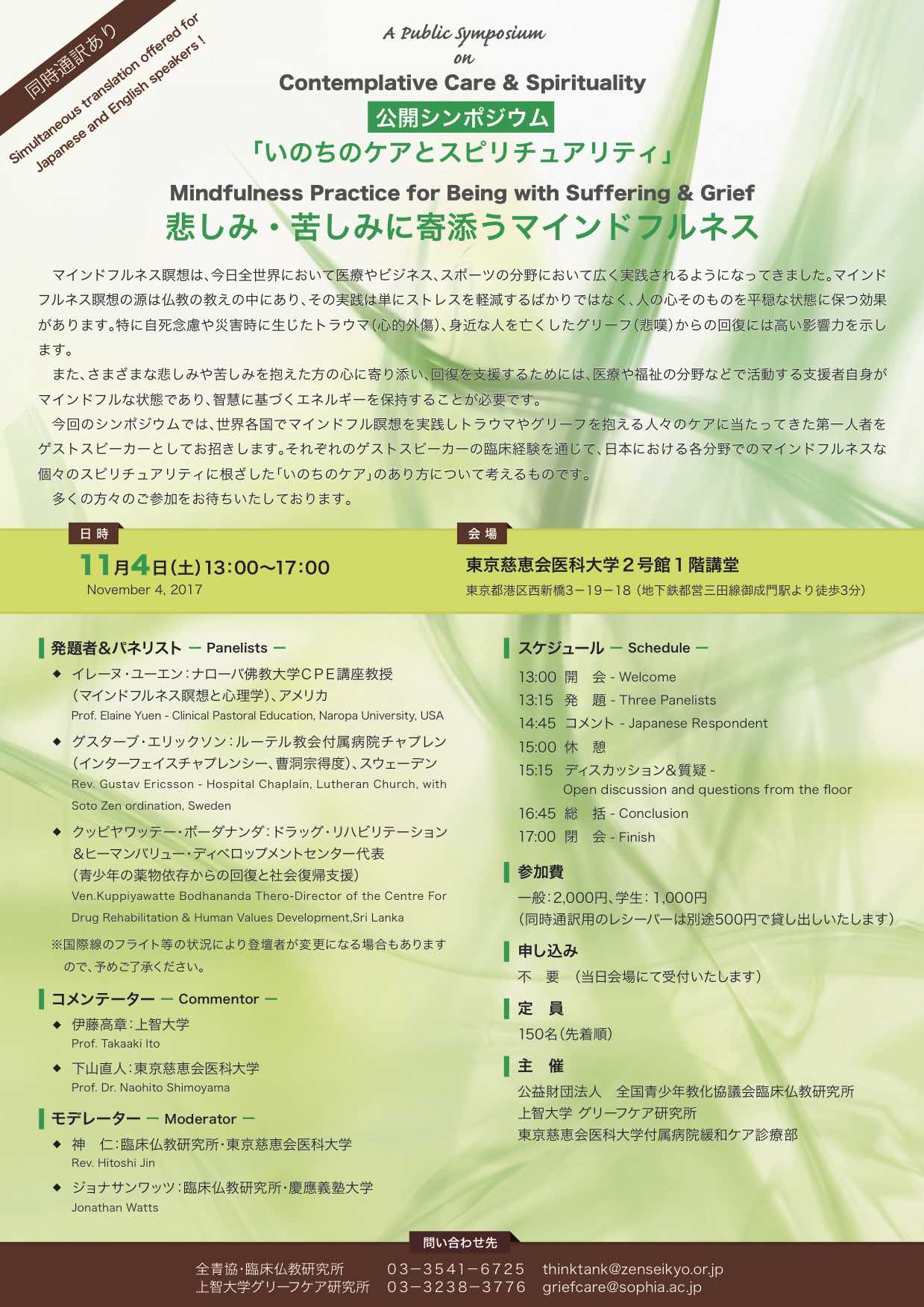 公開シンポジウム:悲しみ・苦しみに寄添うマインドフルネス Posted byWattsjOctober 7, 2017Posted inEvents, featured, 未分類 For information in English, click here Share this: Click to share on X (Opens in new window) X Click to share on Facebook (Opens in new window) Facebook Like Loading... Related