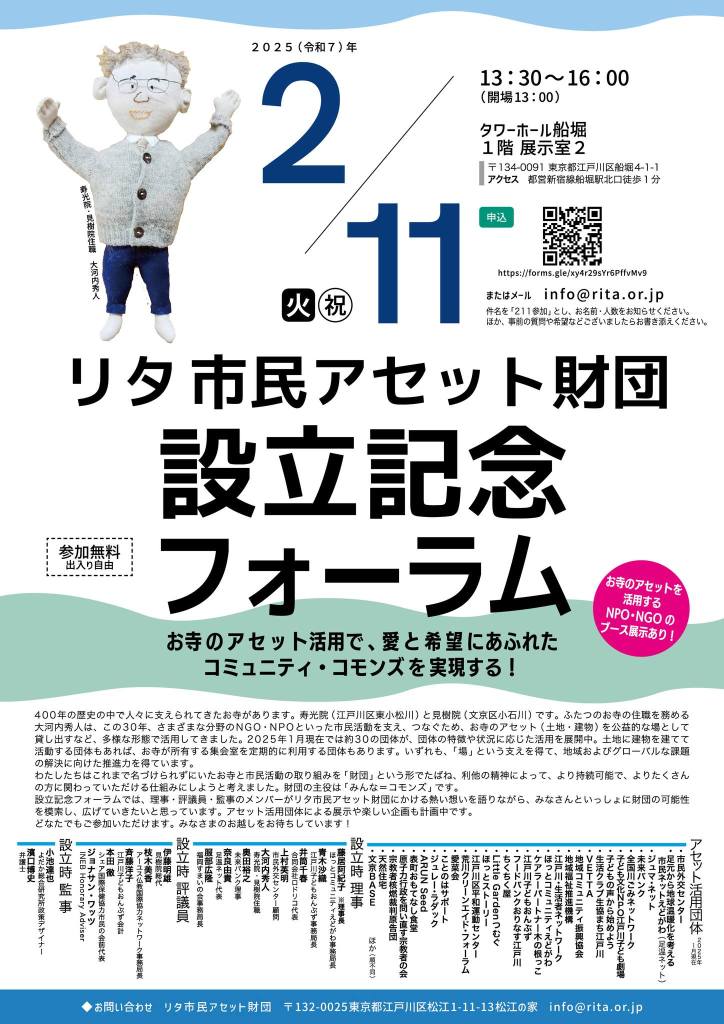 On 11 February, 2025, the Rita Citizen Asset Foundation was established at the Tower Hall Funabori in Edogawa Ward, Tokyo. Many organisations that utilise facilities owned by Juko-in temple, such as the Komatsugawa Citizen Farm, Hotto-kan home for the elderly, and Matsue House for children, as well as those connected to Kenju-in temple, showcased their activities and discussed challenges and significance.