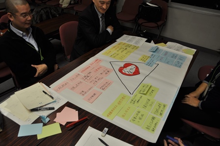 For this group process, we asked the participants to draw up a new 3 point “iceberg of nirvana” and write down three post-its describing in brief the experiential aspects of a healthy community in terms of their specific issue or region. This part of the workshop is particularly open and free, and sometimes participants have difficulty in the more creative work of envisioning. However, vision is an essential process in that it forms the foundation for subsequent action and keeps us rooted when the complexities of engagement confuse or distract us. In this way, the process can be opened further, and participants can be allowed to further chart their vision through imagining values as the enlightened counterpart of cultural dukkha as well as new institutions and systems as the enlightened counterpart of structural dukkha. As participants become more familiar with this method of the Four Noble Truths, they can work more freely within the “iceberg of nirvana”, which is by nature transparent and not broken into seen and unseen parts.